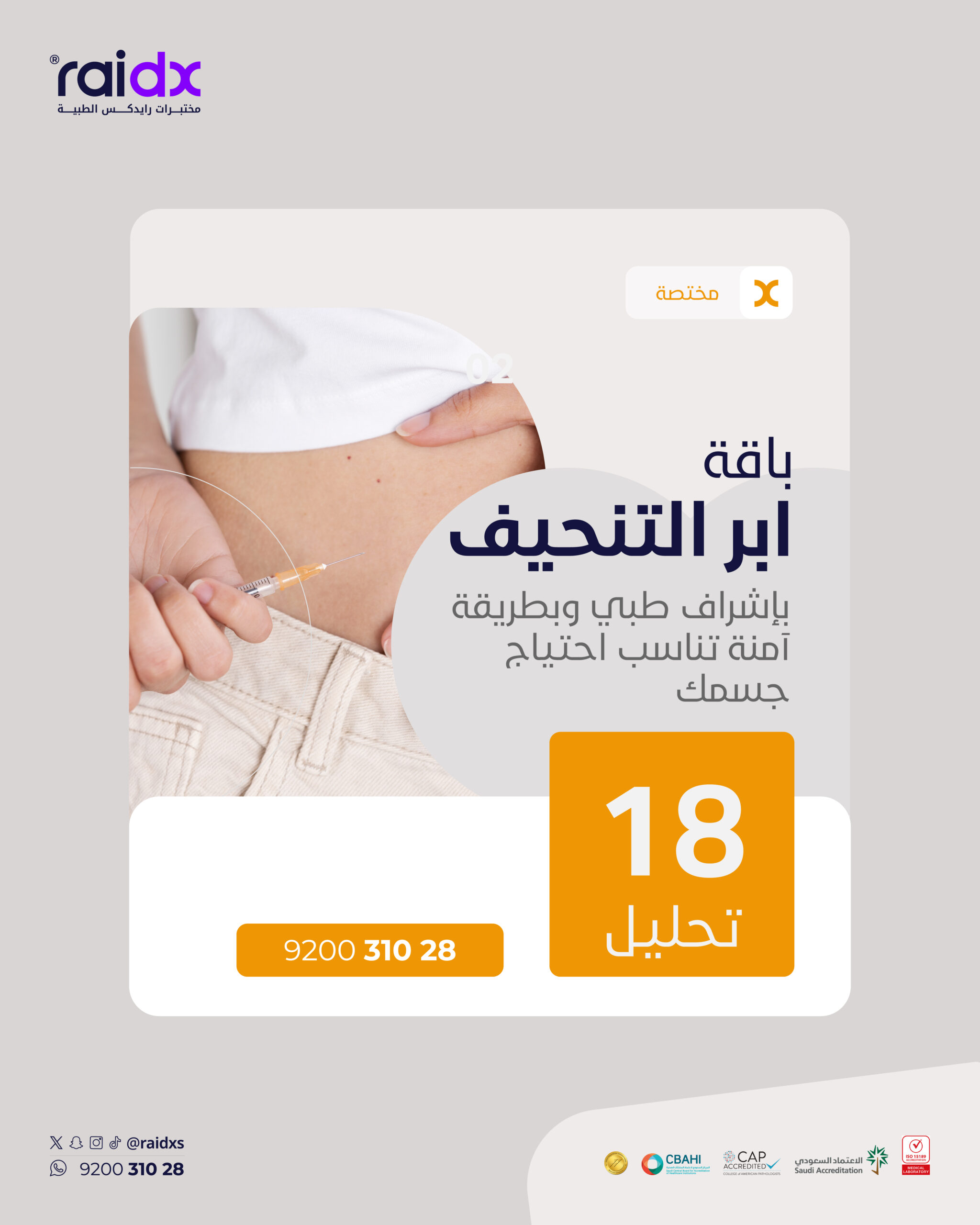 باقة إبر التنحيف صُمّمت خصيصًا للأشخاص الراغبين في بدء رحلة إنقاص الوزن بأمان.تساعد هذه الباقة على تقييم الحالة الصحية العامة قبل استخدام الحقن لضمان نتائج فعّالة وآمنة، كما تُساهم في الكشف عن أي مشكلات قد تعيق العلاج مثل اضطرابات الكبد أو الكلى أو الغدد.تتضمّن أيضًا فحص الفيتامينات والمعادن الأساسية للتأكد من أن الجسم جاهز للنزول في الوزن بشكل صحي ومتوازن دون تعب أو إرهاق، مما يجعلها خطوة ذكية لبدء برنامج التنحيف بثقة واطمئنان.
